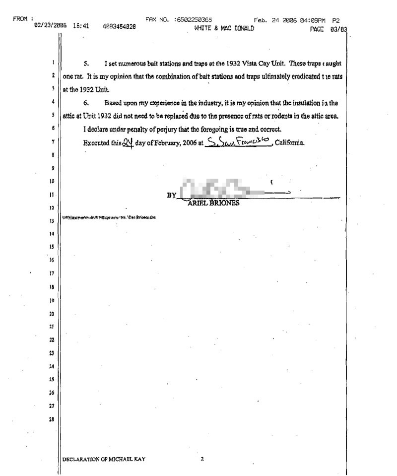 And the HOA's attorney drew up "declarations" from the very vendors that Edgewater Isle North sent to make remedial repairs in this mess. Michael Kay, property manager, provided declarations from Ariel Barones of Terminix, and Denis O'Halloran of Southwood Plumbing. Since both vendors work for the HOA, is it any surprise of their conclusions? Denis O'Halloran wants to keep income to his small business, and Ariel Barones surely wants to keep his job.