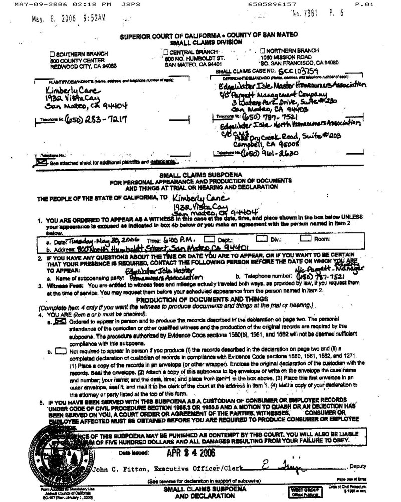 And then, second, the Associations went on their own "fishing expedition" by requesting subpoenas duces tecum ("production of documents and things at trial") to Complete Pest Control and the homeowner's insurance company. But the bomb was that Kelly McGuirk, who has multiple felony convictions for theft, completed the legal forms demanding access to the homeowner's:
