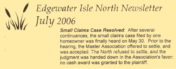 As if that's not enough, Edgewater Isle North lied about the outcome of the case to the homeowners. In the July 2006 newsletter, the board of directors who were so intimately involved in the case, Bert Mittler, Ben Cintas, and Mimi Lee lied about the result.