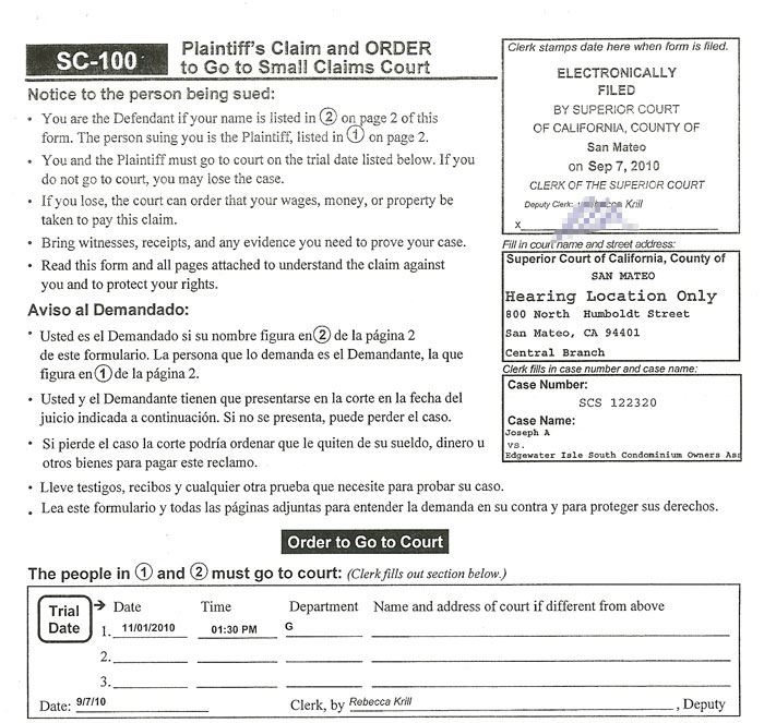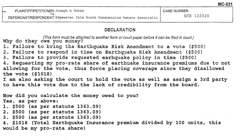 A homeowner sued Edgewater Isle South Condominium Owners Association in Small Claims Court on September 7, 2010, for failure hold a vote on a proper petition of owners who wanted to get out of the earthquake insurance squeeze being forced upon them by the Edgewater Isle South Condominium Owners Association. (This is a separate action from another homeowner who filed on July 23, 2010.)
