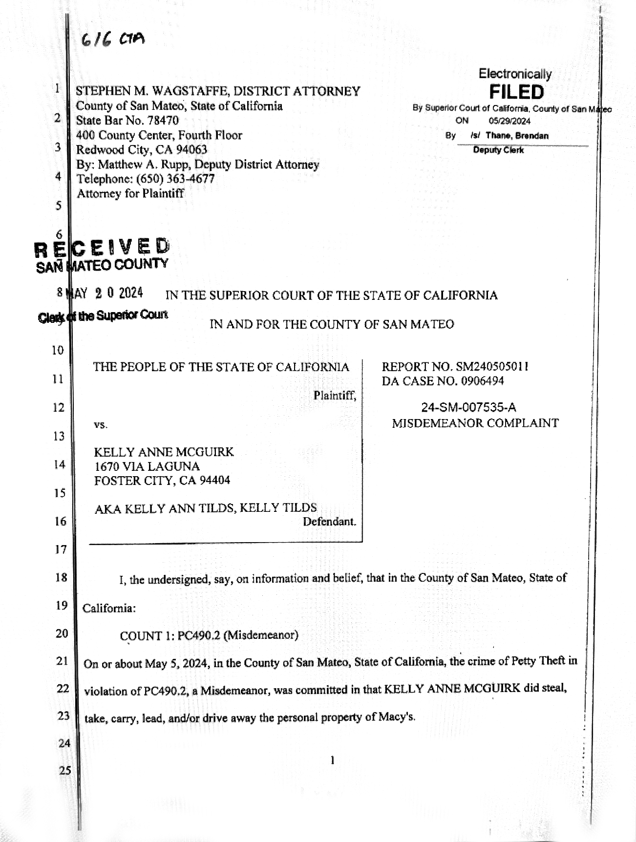 February 24, 2025 — In a Redwood City courtroom last week, Kelly McGuirk had a hearing in her latest petty theft case. In this hearing, McGuirk was arraigned again.