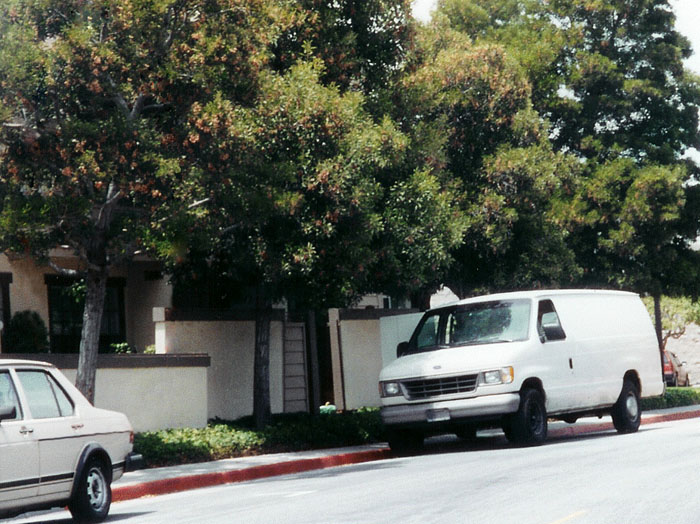 Here, there are 4 acacia trees. One by the short fence, one by the taller fence, and 2 behind the white van.
