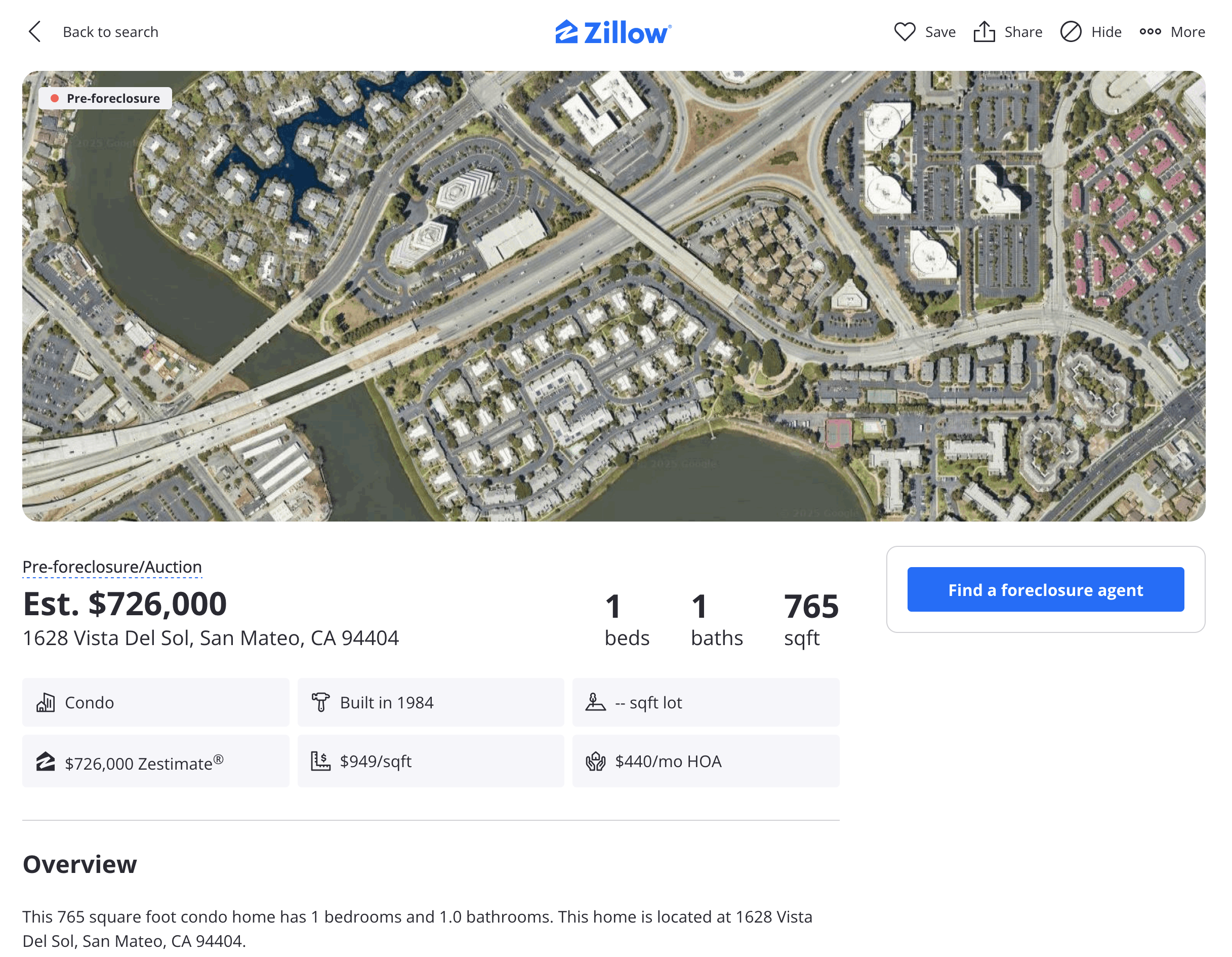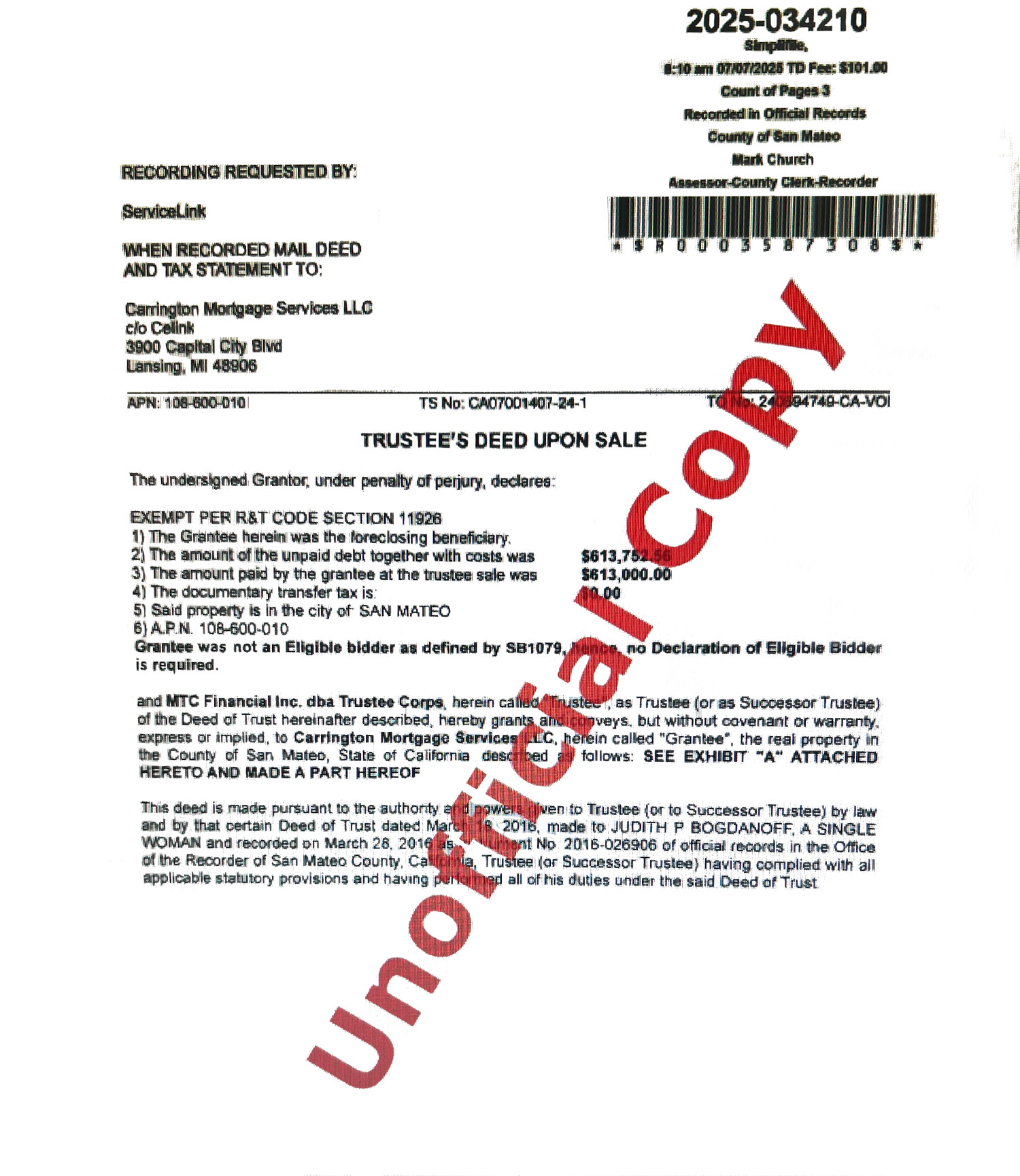 Document 2025-034210 recorded in San Mateo County show this condo's Trustee's Deed Upon Sale, and it shows the total amount of unpaid mortgage on the condo was $613,752. The condo was purchased in 1998 for $180,000 by the now-deceased former owner.